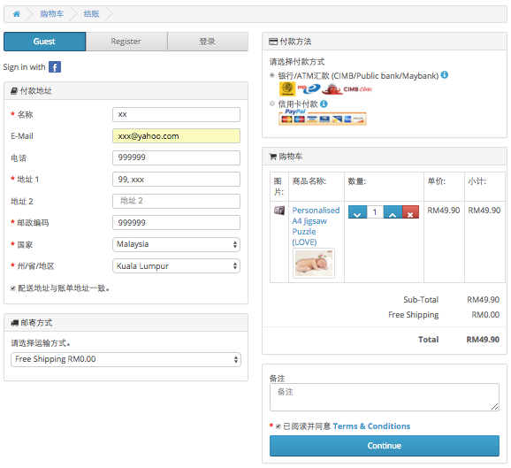 9. Shipping methods will be available after country and state are selected. Select payment method. Click "Continue" to proceed to payment.
